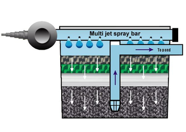 Water is pumped up through the Tempest filter. The K+Media moves to the top of the filter, becoming a mechanical barrier that traps debris as it flows through the system. Waste is trapped in the K+Media until the cleaning cycle dislodges it and it gets flushed away.